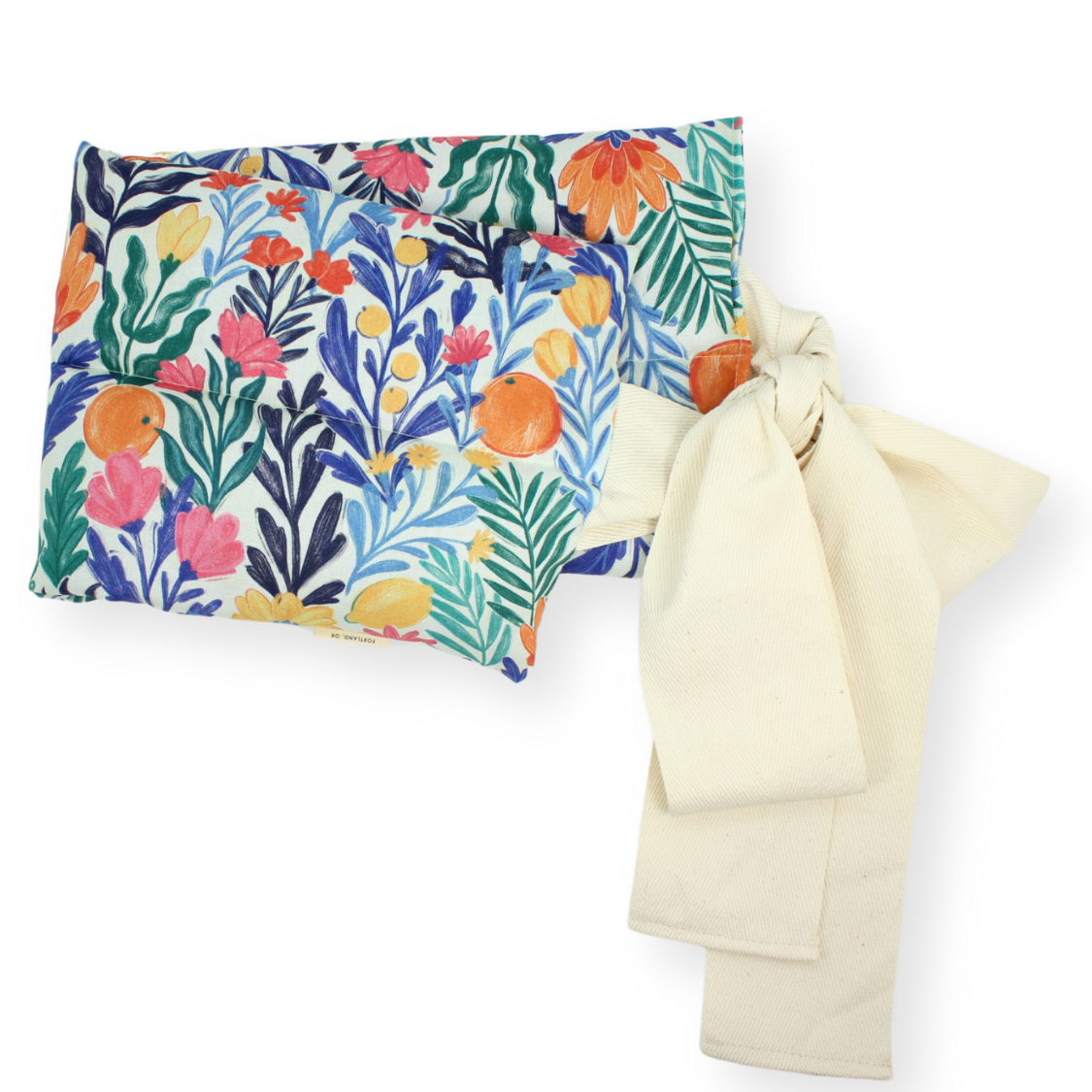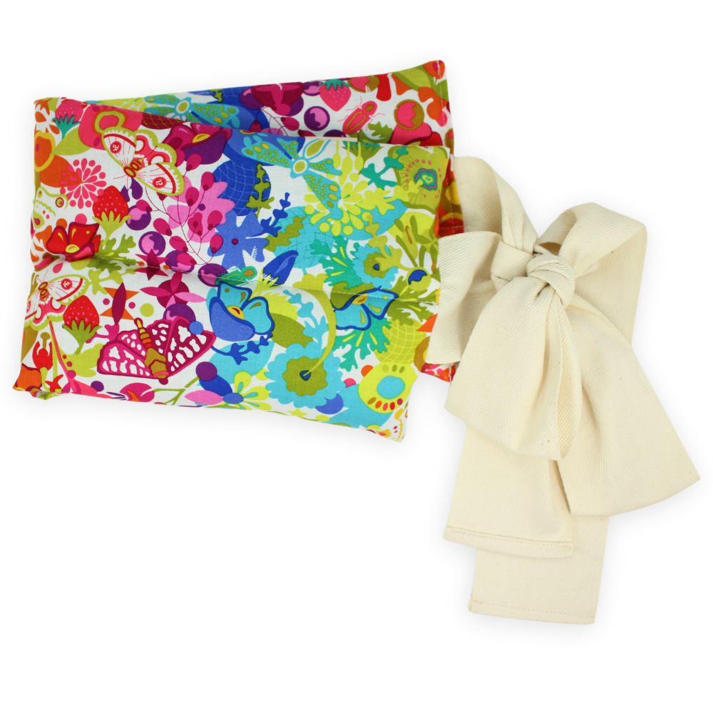 Sweet Dreams relaxation aromatherapy Back Wrap in a variety of cotton prints. The Back Wrap ties around your waist with comfortable 3" wide cotton twill ties to offer soothing heat or a cool, weighted, relief for aching muscles. Our Heating Pads are filled with flaxseed and lavender, or Unscented with flaxseed only.
