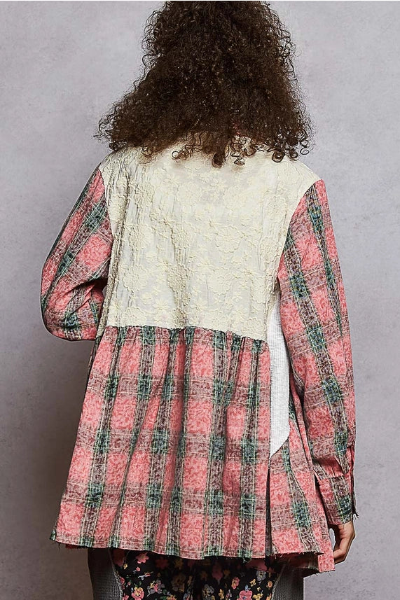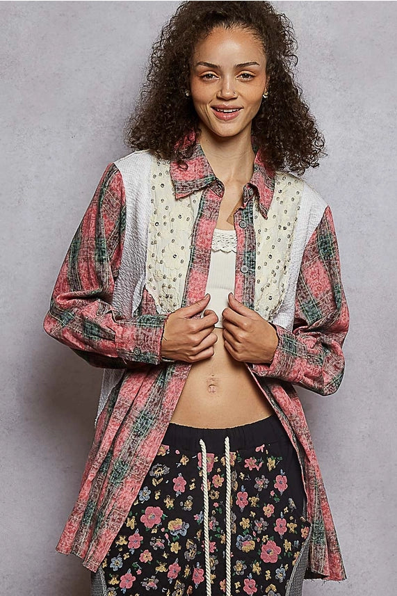 Designed long-sleeve oversized fit shirt in plaid flannel with lace contrast and pearl adornments. Specs/Dimensions: - BUST: 22" - LENGTH (Front + Back): 32" - SLEEVE: 24" - SHOULDER: 17-1/2"
